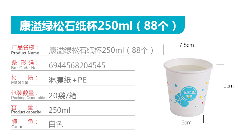 康溢绿松石纸杯250ml(88个)