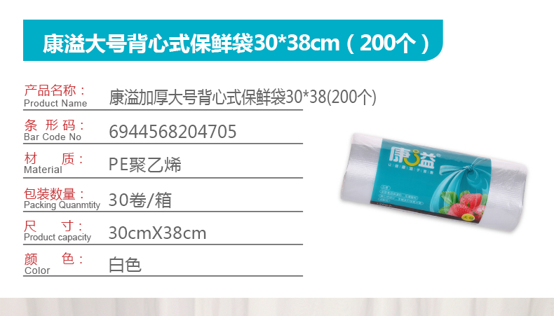 康溢加厚大号背心式保鲜袋30*38(200个)