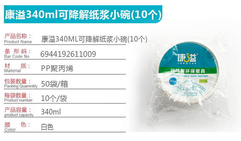 康溢340ml可降解纸浆圆碗(10个)