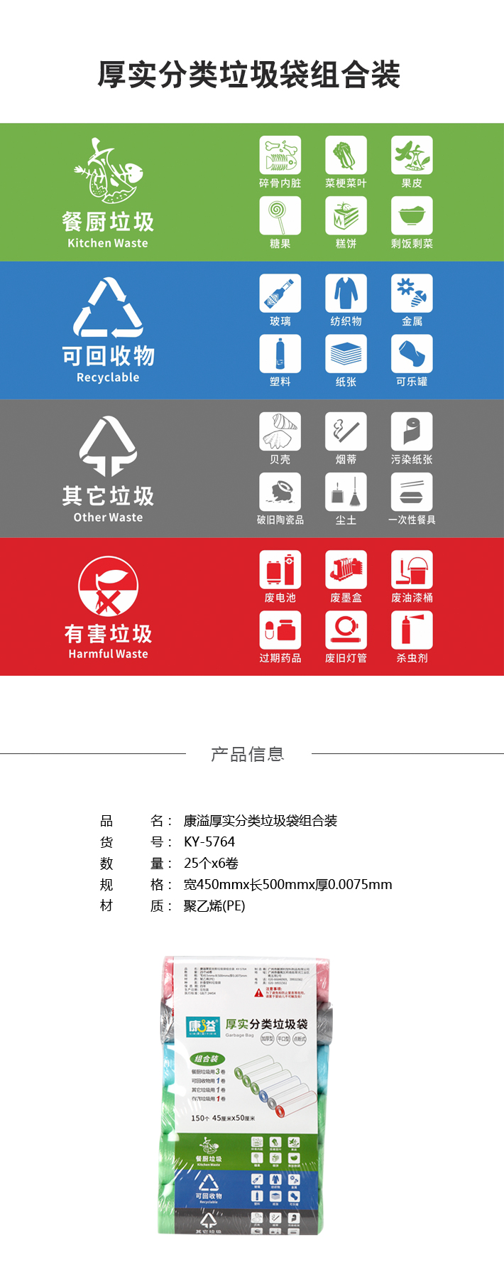 康溢厚实分类垃圾袋组合装 45cmx50cm(25个x6卷)