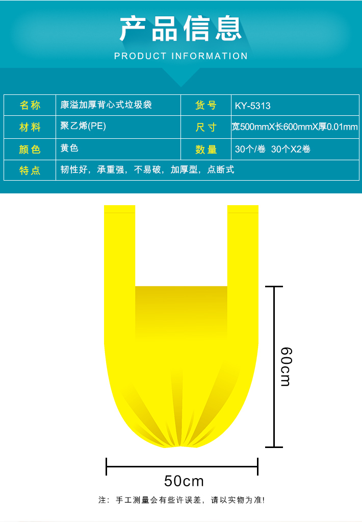 下一个:康溢厚实平口垃圾袋45cmX50cm(黑色25个X4卷)上一个:康溢厚实平口垃圾袋S号40cmX45cm(120个/卷)